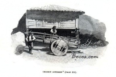 De Valdeón al Sajambre, el camino serpentea entre los verdes mamelones de la cordillera cantábrica, parece el país vasco: bosques, hierba, brezos, cimas redondeadas o jorobadas, afloramientos de agua erosionando la pizarra, arcillas rojas desnudas, un buen olor a montaña y ruido por todas partes. En un lugar de Soto, sobre el largo camino de suave pendiente que remontamos con el caballo del cura, su criado, nuestro guía del pueblo y el fiel Tonio, sale del monte un gran rumor, es un descenso “vernal”(2), un campamento de verano que abandona un grupo agitado de hombres, mujeres y bueyes, que salen de la espesura e invaden el camino con alboroto. Más lejos carros, esos bonitos carros asturianos de Valdeón con llantas góticas, nos cruzan rechinando y traqueteando. Después el camino gira a la izquierda en dirección del Pontón, y a la derecha se eleva una senda escarpada debajo de bosques hasta “Pan de Ruedas”, abierto en el ramal de enlace entre la cumbre de los Pirineos y Peña Bermeja. Hay una insoportable niebla, nuestras barbas gotean y tenemos prisa por dejar el fresco claro que forma el collado. El criado nos deja el caballo.