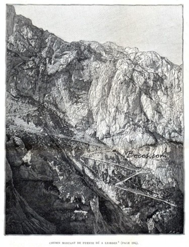 La gran carretera es todavía un mal camino, más caótico que en pendiente, en el desfiladero de los Picayos, donde trabajan un centenar de peones transportando tierras. Pero pronto un vado cerca de Mier, donde el agua se derrama sobre la arena, nos permite pasar a la otra orilla, paisaje alpino, abierto en un claro entre dos gargantas, que giran con un ángulo tan brusco que no deja ver más que un ligero bostezo. Después el sendero sube bajo el bosque, se eleva en los pastos, entre graneros esparcidos y pasa por una especie de pequeño collado. Aquí después de un largo debate se toma una gran decisión: Labrouche se dirige a Ándara y el grueso de la expedición continuará su ruta hacia el pico, que él alcanzara tras una honorable escalada y un copioso desayuno. Todo el mundo ha comido bien, bebido y ha disfrutado del admirable espectáculo de este pico, dominando los frescos territorios de la costa, desde donde parece una gran montaña, y el mismo dominado por los escarpes de Ándara y de los Orriellos, con torres grises y soberbias, desde donde él parece un montículo. Durante este tiempo el pobre Labrouche pasa hambre y miseria. Retomó por fin la vieja ruta de Ándara, cuyas revueltas herbosas y tristes se extienden por el borde de la cresta. Algunos pasos más y Ándara aparece, con su hospitalidad “real” que compensa de todas las fatigas.