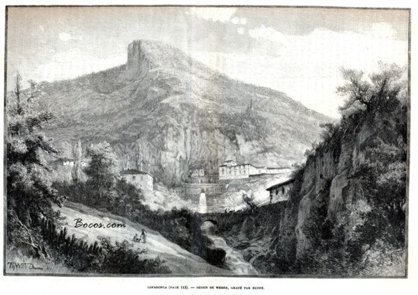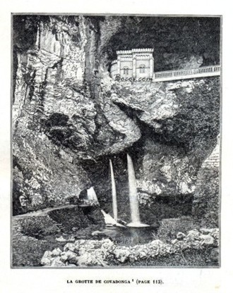 Se sabe que Cangas de Onís, la antigua capital de todas las Españas, que entonces se reducía a la España asturiana, tiene un viejo puente del cual el más alto de sus tres arcos se eleva unos veinte metros, un hotel donde hay festín, y que los habitantes tienen mucha menos prisa de la que tenían los compañeros de Pelayo. La salida de Cangas se parece a las demás, ya que tuvo lugar a una hora intempestiva, pero nuestro cochero no se parece a los otros, ya que tiene una joroba más anormal. Sus caballos marchan mal, y ya hace bastante calor cuando tomamos la carretera a Covadonga. Sobre todo el recorrido, las gentes van por el camino en grupos, vestidos de fiesta, apresurándose a Covadonga, la tierra santa donde van a rezar. En un último recodo de la carretera, a la derecha, sobre una terraza sostenida por muros, se levanta la gran catedral bizantina, donde trabaja un mundo de obreros. Una curva cerrada sube hasta la terraza, yendo a lo largo de la gruta sagrada donde el primer rey de Asturias, milagrosamente ayudado por una tormenta, aplastó a los sarracenos con un puñado de valientes. Los cirios arden, los fieles se arrodillan ante la verja, los canónigos pasean. Hay una atmósfera dulce de piedad patriótica, un concurrir de gentes de todas las clases, aportando el homenaje de su veneración a la antigua imagen de la Virgen de Pelayo.