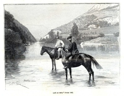 Al día siguiente en coche vamos de Covadonga a Carreña. Se trata de alquilar caballos de monta; el albergue está lleno de ociosos que se mezclan en nuestros asuntos y revuelven nuestros objetos. Bajo el aguacero no sabemos por donde empezar, si entre Macario, el cochero que nos apea, el establecimiento lleno de gente y un patrón que tiene el tiempo que nosotros no tenemos. Los caballos no llegan jamás. Gritamos, reclamamos, y sabemos que están… en la montaña, y que les tendremos al día siguiente. No hay mal que por bien no venga, pues la noche fue horrible; el astuto tendero, que nos olfateaba como clientes, se quedó con las ganas, ya que gracias a nuestras credenciales nos instalamos en casa del cirujano del lugar. Este excelente hombre nos trata extraordinariamente bien y por la mañana nos proporciona caballos bastante buenos. El Cares se encaja desde Arenas en un desfiladero abrupto rodeado de murallas. Al fondo, dominando la garganta, la peña Mellera alza su pico puntiagudo. En Miers se abre el claro por el que vadeamos el río, entonces Saint-Saud pudo, gracias a su Kodak, fotografiar a sus compañeros, que estaban como el a caballo en medio del torrente. Unos pasos más y estamos en la mina de Picayos, donde más tarde esperamos entretener a nuestros lectores, y donde nuestro digno amigo el Sr. De Olavaria preparó una fastuosa recepción, lo que nos hizo dejar su bonita casa, a nuestro pesar, reflejándose en las cristalinas aguas del Cares. En esta segunda expedición, preludio de una tercera campaña, más fecunda en resultados ya que aún teníamos tiempo, este sabio ingeniero fue tan generoso que no sabríamos encontrar la forma de mostrarle nuestra gratitud y que aun nos preguntamos lo que hubiera sucedido sin su preciosa guía. En la última vuelta al Cares todavía mirábamos hacia Picayos sintiendo que en lo sucesivo estaríamos solos y sin amigo, en nuestro viaje de ida y vuelta por la costa de España.