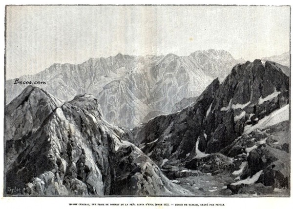 Un collado se levanta a nuestra izquierda y unas murallas muy escarpadas encuadran un pequeño glaciar, aún más escarpado, que desciende. La nieve es tan mala que escalamos por el muro, con los pies, con las manos, marchando sobre los hombros de los guías o haciéndonos izar por ellos. En el collado Blas muestra su silueta negra en la horcadura azul. Nos juntamos y calzamos nuestras sandalias. Después de una pequeña subida pisamos una minúscula terraza cerrada por todas partes. Blas nos muestra una chimenea un poco vertical y nos anima a seguirle. Nuestra sabia resolución nos hace dudar. Intentamos por la roca; pero cae a plomada. Hacia delante, en la chimenea se abre el más horrible paso que se pueda imaginar, que atravesamos sin cuerda y sin escala. En un punto el pasillo avanza en promontorio y forma gruta: hay que dar un fantástico salto de tres metro; el primero que desciende sirve de apoyo a los otros, y toda la tropa se refugia bajo el peñasco, asistiendo a la caída rápida de los cuerpos sobre la cabeza. Salvado este mal paso, la pared es completamente lisa, lo que se hace habitual, y no teniendo miedo ni del vacío ni de los resbalones llegamos a la cumbre.