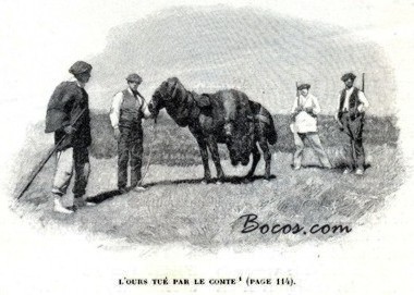 Partimos con un calor sofocante y la subida es penosa, en una cañada descubierta a lo largo de grupas arboladas. Detrás de nosotros, el mar azul llega hasta el infinito, los barcos pasan. Encontramos un grupo animado, un mulo encapuchado, hombres con armas: cazadores de Cangas, conducidos por el conde del Valle del Sella que vienen de una batida al oso y traen una captura. El oso viene a horcajadas sobre la mula cuyo olor a fiera le hace cocear, y nos cuesta trabajo fotografiar a la terca bestia. Una subida más y delante de nosotros redondea el único gran lago de los Picos de Europa , el lago Enol, en una cuenca que verdea, mostrando su amplio estanque de aguas claras, a más de mil metros de altura y frente al océano. Sobre un alto de la hondonada, medio hundida por el huracán se eleva una casa de canónigos Toda una aldea de pastores de verano se oculta en una vertiente. Hay multitud de gente y ruido en este delicioso lugar, que el macizo de Peña Santa domina a lo lejos desde sus altas murallas, de un gris casi blanco moteado de nieves. El camino bastante rugoso sigue a lo largo de la orilla izquierda. Nuestros hombres sufren con la temperatura tórrida y murmuran de la carga que encuentran excesiva.