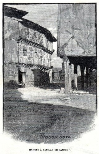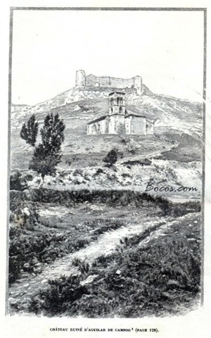 ¡Alto! La historia no ha terminado. Pasamos delante del puesto de la guardia civil: dos guardias saltan sobre nosotros como si fuéramos bandidos: ¡Deteneos! ¡Esto era el colmo! ¡Pasar la noche en prisión después de una aventura tan loca! Labrouche opina que cedamos ante la fuerza; pero Saint Saud soberbiamente grita a nuestros hombres: ¡Por favor sigan y no se preocupen del resto! Nada más, en efecto, los guardias nos piden perdón del error, más confundidos que el cuervo de la fábula. «Señores ingenieros, discúlpennos». ¿Qué es lo que nos valió este triunfo? ¡Las piquetas de la tienda, las bonitas piquetas forrados de cobre y con la punta de acero que brillan a la luna, y que la guardia civil tomó por miras, tomándonos por los constructores del ferrocarril de Bilbao a León!. A dos horas de Cervera, Aguilar de Campoo baña en el fresco Pisuerga sus viejas murallas. Una elegante iglesia del siglo XIV, antiguas mansiones, un castillo arruinado dirigiendo sus torres desmochadas sobre los montículos desnudos, donde la hierba es lisa como el hielo, dos capillas románicas sobre la loma de extrañas rocas, figuran tantas ruinas extrañas en una villa que no se contenta con lo que le ha hecho la irreparable ofensa de los tiempos: es Castilla.