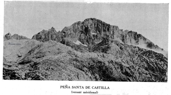Nosotros, franceses, sufrimos como una angustia sintiéndonos sobre la montaña misteriosa. No es solamente la sublime impresión de dominar la cima más alta del extremo de Europa, una cima que no tiene su igual al oeste, más que a 4.000 leguas más lejos en las Montañas Rocosas; ni tampoco es solamente la inolvidable belleza de los horizontes azules y rojos de este mar claro franjeado de espuma y bordeado de aldeas blancas, de profundas llanuras de Castilla rojizas y recalentadas, de masas rígidas y almidonadas que forman prodigiosos amontonamientos de torres y conos, de la costa de Francia. Se trata de otra cosa. La Peña Santa es la síntesis de una tradición y de una epopeya. Este bastión con coronamientos góticos, ha participado en la lucha de la España cristiana contra la España mora; las cavernas abrigaron a Pelayo, las nieves han dado de beber a los guerrilleros, las piedras armaron a los héroes. Se destaca de este encaje de torrecillas como un inmenso recogimiento místico, una piadosa leyenda hecha de lo desconocido.