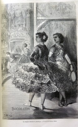 Se levanta el telón y la brincadora pareja aparece por opuestos lados, como dos amantes separados que, después de larga busca, se vuelven a encontrar, y parece como si el público no existiera para ellos y sólo vivieran el uno para el otro. El brillo del fino traje del majo y la maja parece inventado para este baile: el centelleo del oro y de la filigrana prestan más ligereza a sus movimientos; la saya transparente y que dibuja la forma de la mujer, realza el encanto de la línea armónica que gustosamente ocultaría, y no tiene cruel corsé que aprisione su serpentina flexibilidad. Se detienen, se inclinan un momento hacia adelante, probando la flexibilidad de sus miembros y de sus brazos; rompe la música, vuélvense tiernamente el uno hacia el otro y despiertan a la vida. ¿Qué ejercicio puede hacer resaltar mejor los siempre variables encantos femeninos, y los perfiles de la formas varoniles, que este baile fascinador? El acompañamiento de las castañuelas da ocupación a los levantados brazos. Los franceses dicen: