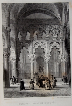 Poco hay que decir de Córdoba, ciudad pobre, sucia y triste, llena de angostas callejuelas, sin plazas ni edificios públicos dignos de atención, salvo y excepto su Catedral, dondequiera famosa; su emplazamiento es, sin embargo, bello y pintoresco. Corre por un lado el Guadalquivir, que, si bien poco profundo en estos lugares y lleno de bancos de arena, no deja de ser un río deleitoso; por el otro se alzan las escarpadas vertientes de Sierra Morena, plantadas de olivares hasta la cima. La ciudad está rodeada de altas murallas moriscas, que pueden tener hasta tres cuartos de legua de desarrollo; a diferencia de Sevilla y de la mayoría de las ciudades de España, carece de arrabales. La Catedral, único edificio notable de Córdoba, como ya he dicho, es acaso el templo más extraordinario del mundo. Fue en su origen, como todos saben, una mezquita, erigida en los días más brillantes de la dominación árabe en España. Era de planta cuadrangular y de techo bajo, sostenido por infinidad de redondas columnas de mármol, pequeñas y finas, muchas de las cuales subsisten aún, y ofrecen al primer golpe de vista la apariencia de un bosque de mármol; la mayor parte de ellas, sin embargo, fueron quitadas cuando los cristianos, después de expulsar a los muslimes, quisieron transformar la mezquita en catedral, como, en efecto, la transformaron parcialmente, levantando una cúpula y despejando en el interior un cierto espacio para hacer el coro. Tal como hoy está el templo parece pertenecer en parte a Mahoma, y en parte al Nazareno; y aunque la mezcla de la pesada arquitectura gótica con el aéreo y delicado estilo de los árabes produce un efecto algo raro, todavía el edificio es magnífico y grandioso, y muy adecuado para suscitar el respeto y la veneración en el ánimo del visitante. Los moros de Berbería parecen cuidarse muy poco de las hazañas de sus antepasados: sólo piensan en las cosas del día presente, y únicamente hasta donde esas cosas les conciernen de un modo personal. El entusiasmo desinteresado y la admiración por cuanto es grande y bueno, señales verdaderas e inconfundibles de un alma noble, son sentimientos que en absoluto desconocen. Asombra la indiferencia con que cruzan ante los restos de la antigua grandeza mora en España. Ni se exaltan ante las pruebas de lo que en otro tiempo fueron los moros, ni la conciencia de su situación actual les entristece. Vienen |